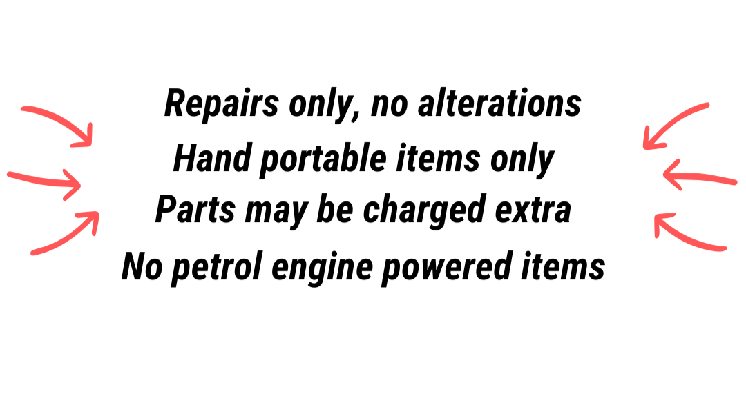 We will accept and attempt to fix any small household items, as well as offer minor bike repairs/servicing and small clothing repairs.